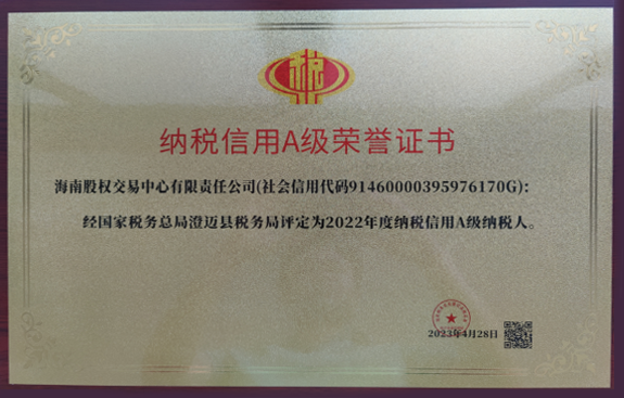 近日,在國家稅務總局澄邁縣稅務局納稅信用等級評定工作中,海南股交獲得“2022年度納稅信用A級納稅人”榮譽。海南股交自成立以來,認真執行國家稅收法律法規和相關制度規定,履行納稅義務,積極配合稅務機關的各項...