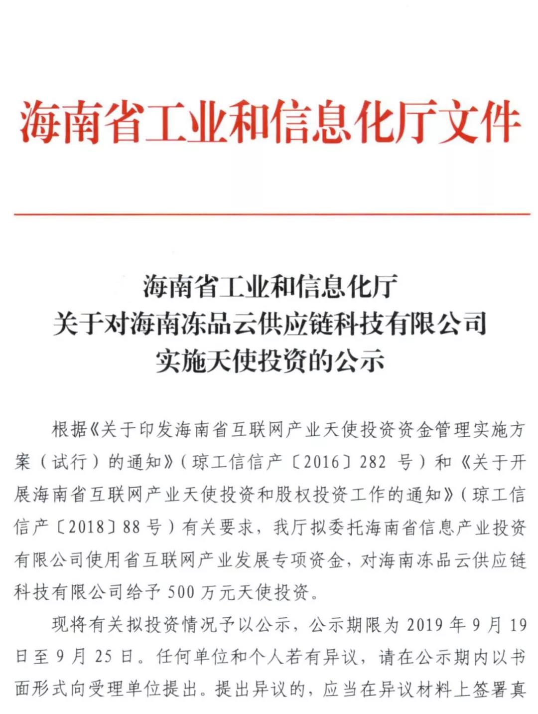 近期,海南省工業(yè)和信息化廳發(fā)布關于對海南股權交易中心掛牌企業(yè)海南凍品云供應鏈科技有限公司實施天使投資的公示,擬委托海南省信息產業(yè)投資有限公司使用省互聯(lián)網產業(yè)發(fā)展專項資金,對海南凍品云供應鏈科技有限公司...