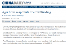 10月17日,國家英文日報《ChinaDaily》刊發文章《Agrifirmsreapfruitsofcrowdfunding》,對海南股權交易中心“眾籌海南”項目進行了深入的報道。文章分析,“Crowdfundinghashelpedboostthebusinessofagriculturalco...