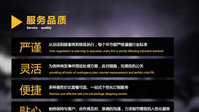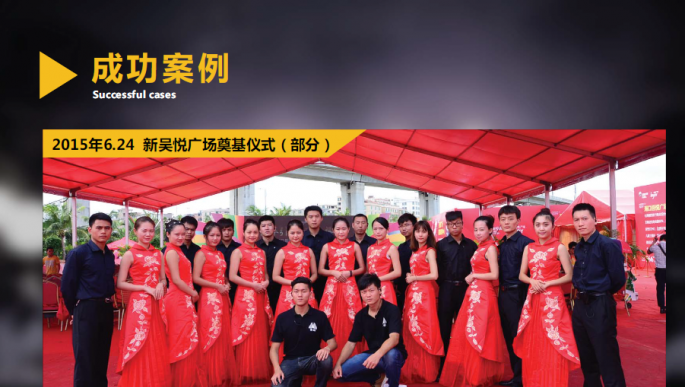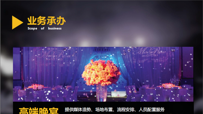 | 主營業務: | 電腦圖文設計制作、企業形象策劃、展覽展示服務、市場調研、攝影服務、資料翻譯服務、禮儀服務、賽事活動策劃、公共活動策劃、快遞服務、室內保潔服務、婚慶禮儀服務、餐飲管理。 |