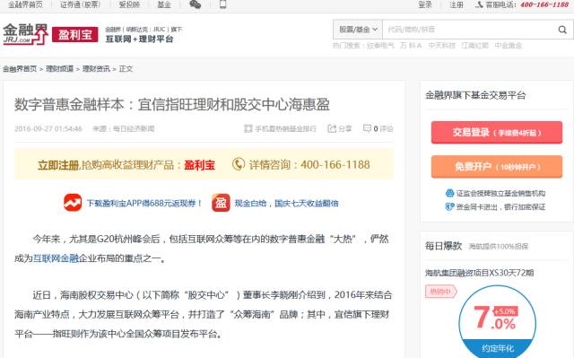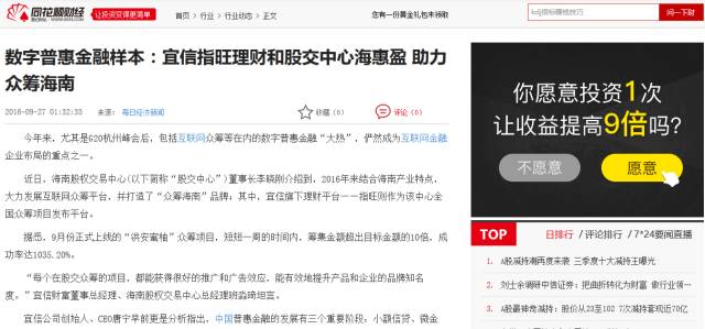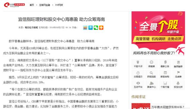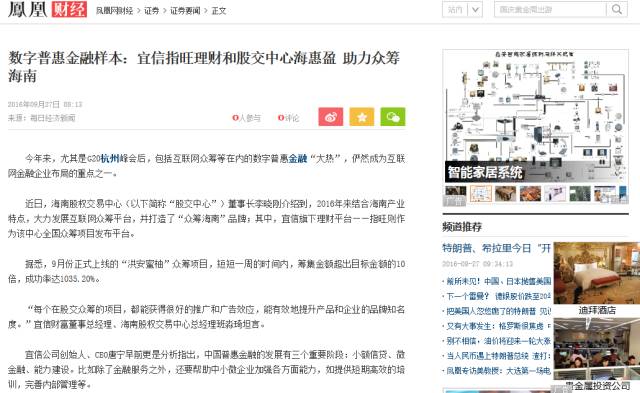 近日,海南股權交易中心(以下簡稱“股交中心”)董事長李曉剛介紹到,2016年來結合海南產業(yè)特點,大力發(fā)展互聯(lián)網眾籌平臺,并打造了“眾籌海南”品牌;其中,宜信旗下理財平臺——指旺則作為該中心全國眾籌項目發(fā)布平臺。