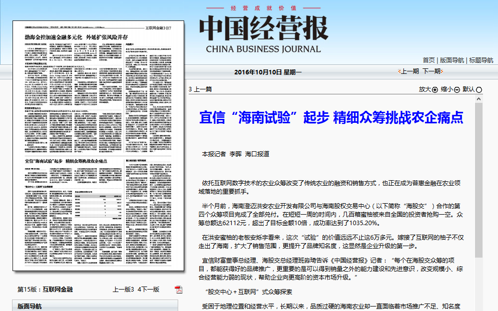 近日,國內最早發(fā)行經濟類的報刊之一《中國經營報》在其互聯(lián)網金融版上報道“眾籌海南”,文章以《宜信“海南試驗”起步 精細眾籌挑戰(zhàn)農企痛點》為題,表示依托互聯(lián)網數(shù)字技術的農業(yè)眾籌改變了傳統(tǒng)農業(yè)的融資和銷售方式,也正在成為普惠金融在農業(yè)領域落地的重要抓手。