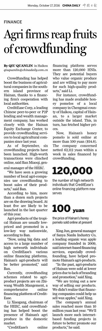 10月17日,國家英文日?qǐng)?bào)《China Daily》刊發(fā)文章《Agri firms reap fruits of crowdfunding》,對(duì)海南股權(quán)交易中心“眾籌海南”項(xiàng)目進(jìn)行了深入的報(bào)道。