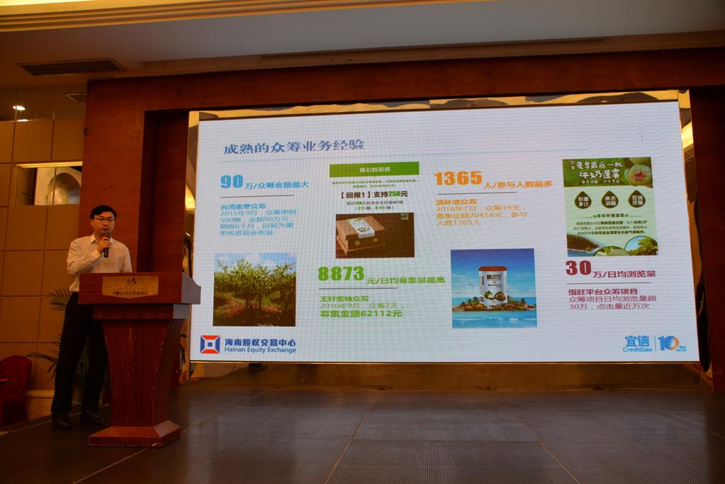 隨后,股交中心副總經理程棟才就2017年度“眾籌海南,訂制農旅”項目情況及具體內容作了詳細的介紹,指出此次股交中心推出“眾籌海南,訂制農旅”項目目的在于聚焦海南特色資源,推廣海南特色農產品,促進農旅融合,進一步推動企業發展。