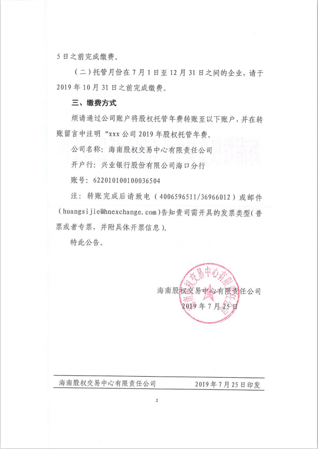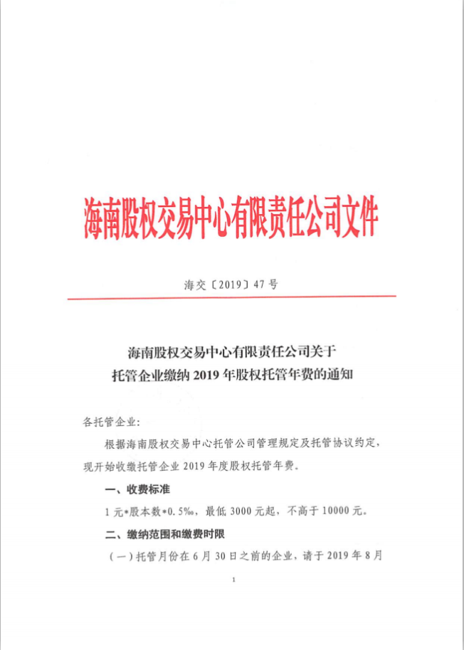 海南股權交易中心有限責任公司關于托管企業繳納2019年股權托管年費的通知