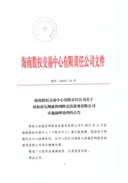 海南股權(quán)交易中心有限責(zé)任公司 關(guān)于對海南九洲盛世網(wǎng)絡(luò)競技游戲有限公司 實(shí)施摘牌處理的公告
