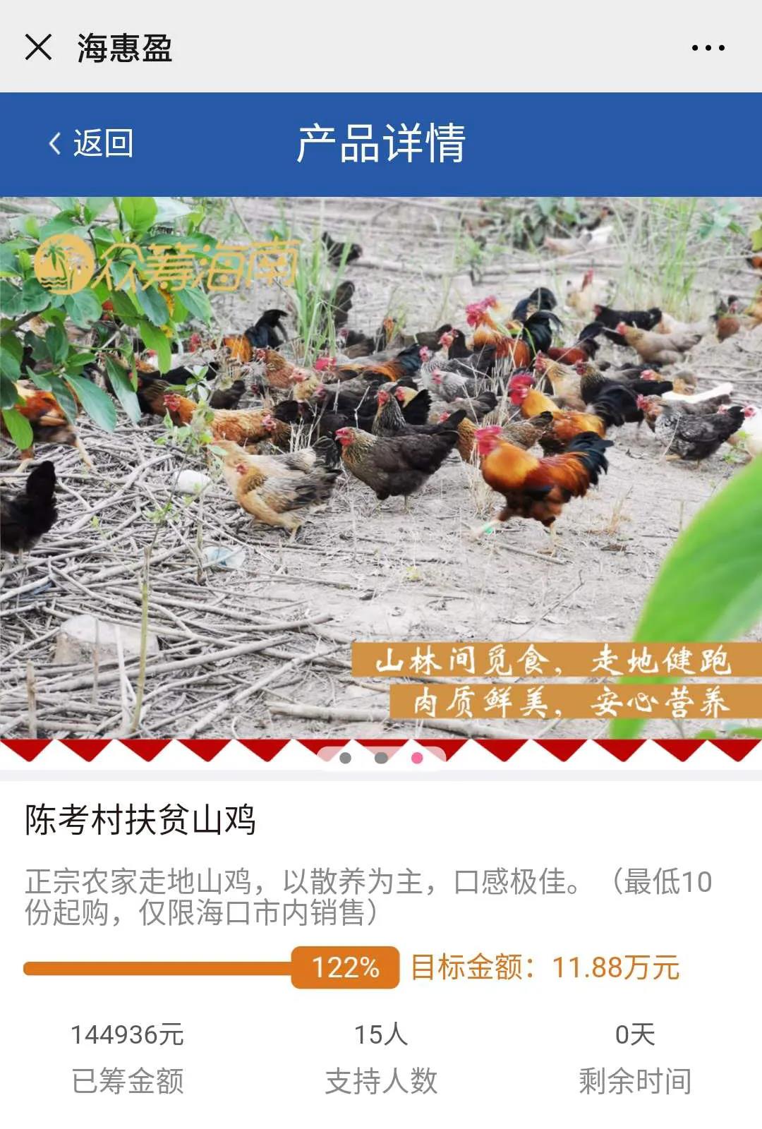 為了持續(xù)幫助海南省樂東縣大安鎮(zhèn)陳考村村民打開當(dāng)?shù)貎?yōu)質(zhì)農(nóng)產(chǎn)品的銷路,在海南證監(jiān)局的指導(dǎo)下,海南股交借助“互聯(lián)網(wǎng)+農(nóng)業(yè)眾籌”的形式,再次幫助陳考村村民享受“互聯(lián)網(wǎng)+”的發(fā)展紅利。海南股交旗下綜合金融服務(wù)平臺“海惠盈”于4月7日推出“陳考村扶貧山雞”項目,開啟新一期的扶貧眾籌活動,截止4月27日,該項目完成率122%,眾籌金額14.4萬余元。