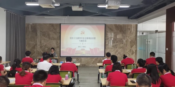 吳惠玉從十九屆四中全會的重大意義,中國特色社會主義制度發展和我國國家治理的歷史成就,中國特色社會主義制度和國家治理體系的十三個顯著優勢,堅持和完善中國特色社會主義制度、推進國家治理體系和治理能力現代化的總體要求、總體目標、重點任務等方面,對會議精神進行了系統闡述和深入解讀。同時,她把學習貫徹黨的十九屆四中全會精神,結合到海南自貿港建設上來,帶領全體員工學習《海南自由貿易港建設總體方案》重要政策信息。