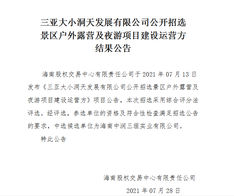 三亞大小洞天發展有限公司公開招選景區戶外露營及夜游項目建設運營方結果公告