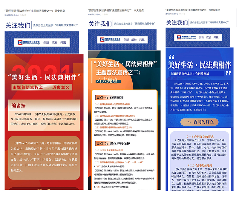 2021年7月7日-29日期間,海南股交通過邀請知名專家、投資機構(gòu)進行線上授課和微信公眾號平臺轉(zhuǎn)發(fā)“民法典主題普法宣傳”等形式,開展企業(yè)培育宣傳活動。其中,線上課程向掛牌公司、展示企業(yè)、托管企業(yè)尤其是“專精特新”企業(yè)定向邀約,邀請企業(yè)代表參加《“商業(yè)計劃書”系列課程》兩堂線上直播課,直播課在線參與人數(shù)922名,活動取得了良好效果。