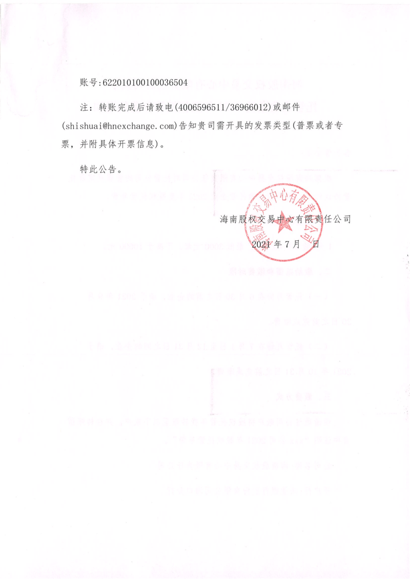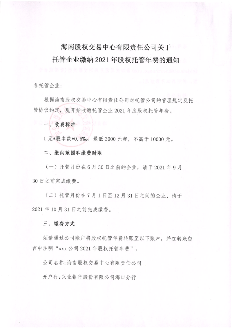 海南股權交易中心有限責任公司關于托管企業繳納2021年股權托管年費的通知