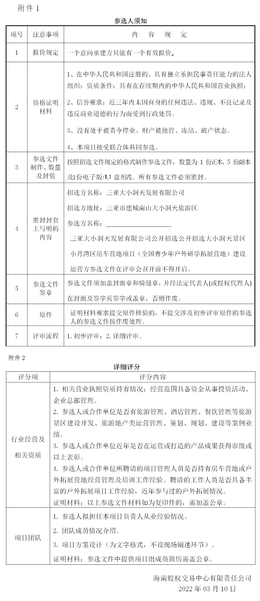 三亞大小洞天發展有限公司公開招選小月灣區房車營地項目(全國青少年戶外研學拓展營地)建設運營方
