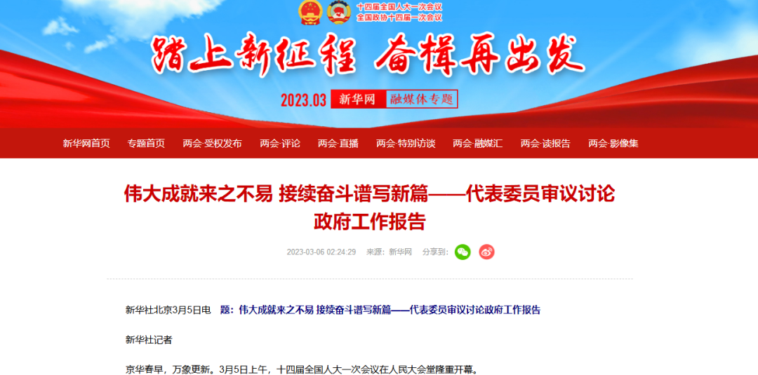 報道圍繞政府工作報告,采訪出席兩會的全國人大代表、全國政協委員。報道提及: