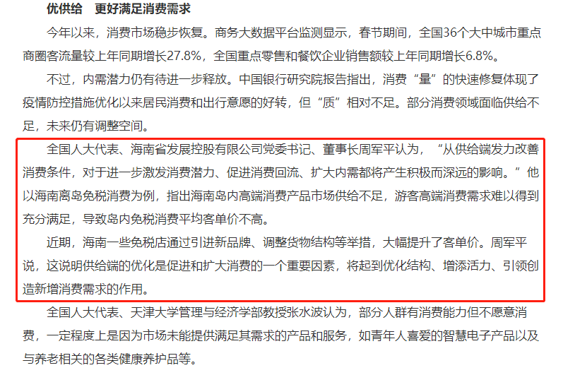 報道圍繞“如何讓消費‘熱’起來?怎樣解決不便消費、不愿消費、不敢消費等突出問題以釋放消費潛力?”采訪全國兩會代表委員。報道提及:全國人大代表、海南省發展控股有限公司黨委書記、董事長周軍平認為,“從供給端發力改善消費條件,對于進一步激發消費潛力、促進消費回流、擴大內需都將產生積極而深遠的影響?!彼院D想x島免稅消費為例,指出海南島內高端消費產品市場供給不足,游客高端消費需求難以得到充分滿足,導致島內免稅消費平均客單價不高。近期,海南一些免稅店通過引進新品牌、調整貨物結構等舉措,大幅提升了客單價。周軍平說,這說明供給端的優化是促進和擴大消費的一個重要因素,將起到優化結構、增添活力、引領創造新增消費需求的作用。