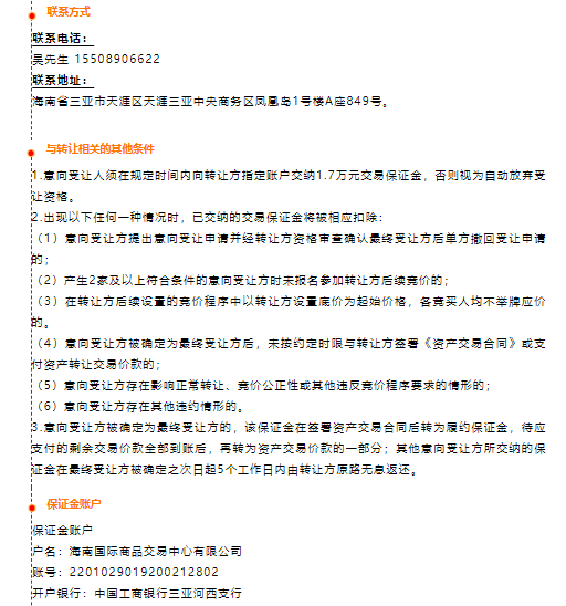以上資產(chǎn)信息僅供參考,由轉讓方對資產(chǎn)的真實性、合法性、準確性負責,最終以資產(chǎn)權屬證明、合同、他項權證、法院判決書等有關資料為準。本轉讓信息不構成要約,具體以轉讓雙方后續(xù)簽署的相關協(xié)議為準。因簽訂或履行相關協(xié)議所產(chǎn)生的一切糾紛及法律后果等由轉讓雙方承擔,海南股交不承擔責任。