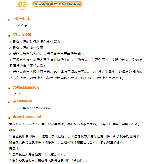 根據(jù)相關法律法規(guī),受委托,海南股權交易中心有限責任公司公開披露以下資產(chǎn)轉讓信息,廣泛征集意向受讓方。特別提示:轉讓掛牌有效期滿,只產(chǎn)生一個符合條件的意向受讓人,采取協(xié)議轉讓方式成交;產(chǎn)生兩個(含)以上符合條件的意向受讓人,將采取競價方式成交。