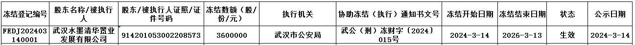 依據武漢市公安局《協助凍結財產通知書》[武公(刑)凍財字〔2024〕015號]文件,我中心為海南屯昌長江村鎮銀行股份有限公司(企業代碼:893524)股東武漢水墨清華置業發展有限公司辦理股權凍結登記,具體情況如下: