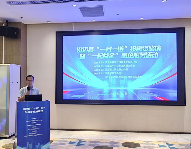 為進一步活躍澄邁縣投融資氛圍,實現(xiàn)企業(yè)與資本的高效聯(lián)合,10月22日,澄邁縣“一月一鏈”投融資路演暨“一起益企”惠企服務活動在老城科技新城成功舉辦。本次活動由澄邁縣科學技術和工業(yè)信息化局主辦、海南省中小企業(yè)發(fā)展服務中心承辦、澄邁縣人民政府辦公室支持、海南股權交易中心協(xié)辦,相關投融資機構以及中小企業(yè)代表等共計三十余人參加活動。