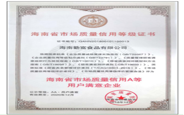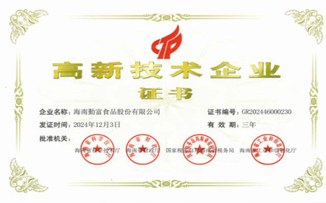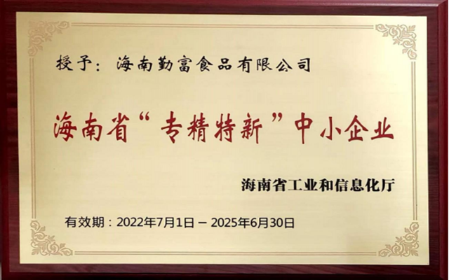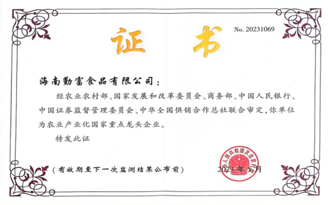 海南勤富食品股份有限公司2018年獲得海南省科技產(chǎn)業(yè)十大影響力領(lǐng)軍企業(yè);連續(xù)獲得海南省第七屆、第八屆、第九屆優(yōu)秀企業(yè);連續(xù)獲得海南省第五屆、第六屆、第七屆杰出民營企業(yè);2019年獲得文昌市脫貧攻堅工作先進(jìn)單位。